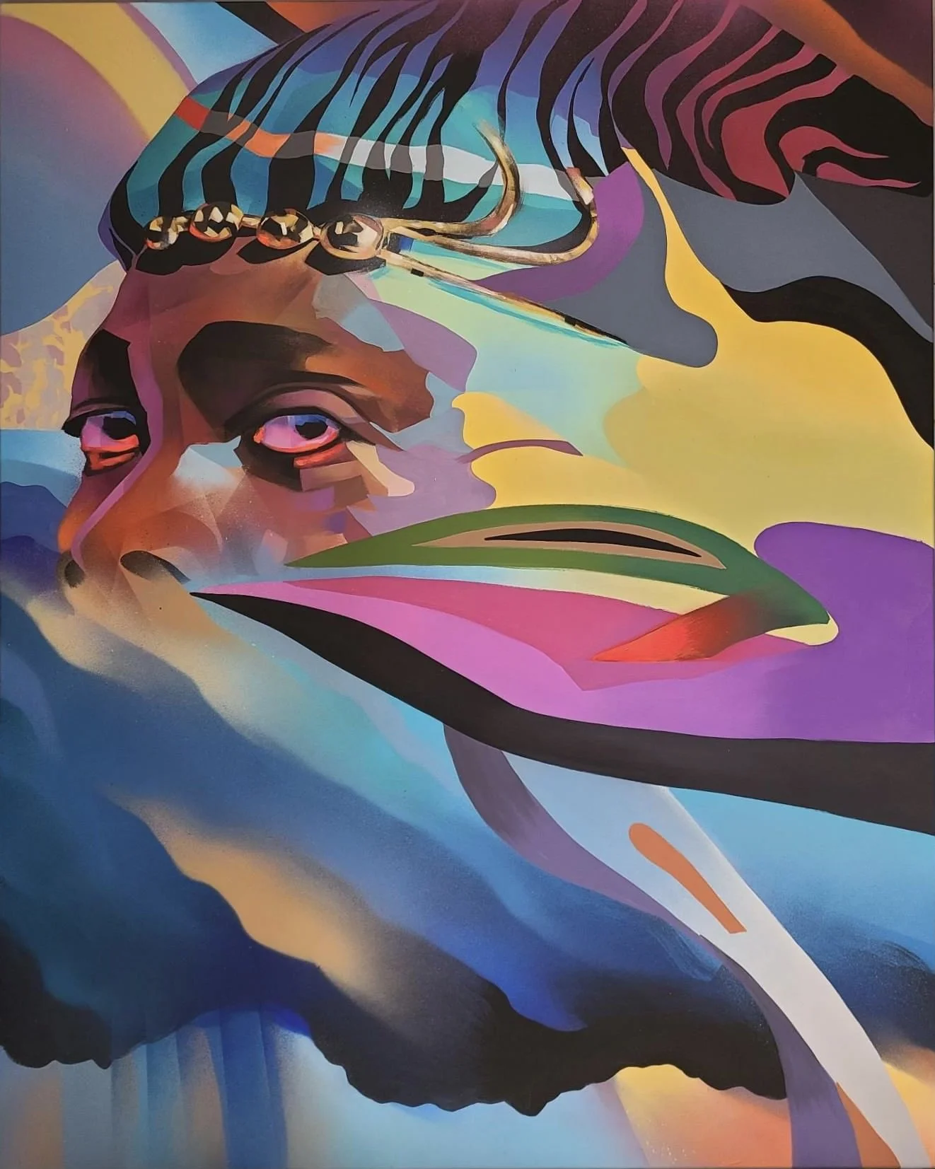 The painting is a spirit guide, a guardian angel, watching over the people in the centre. The intention is to evoke positive feelings through its colours and imagery, even if it’s for a few seconds.